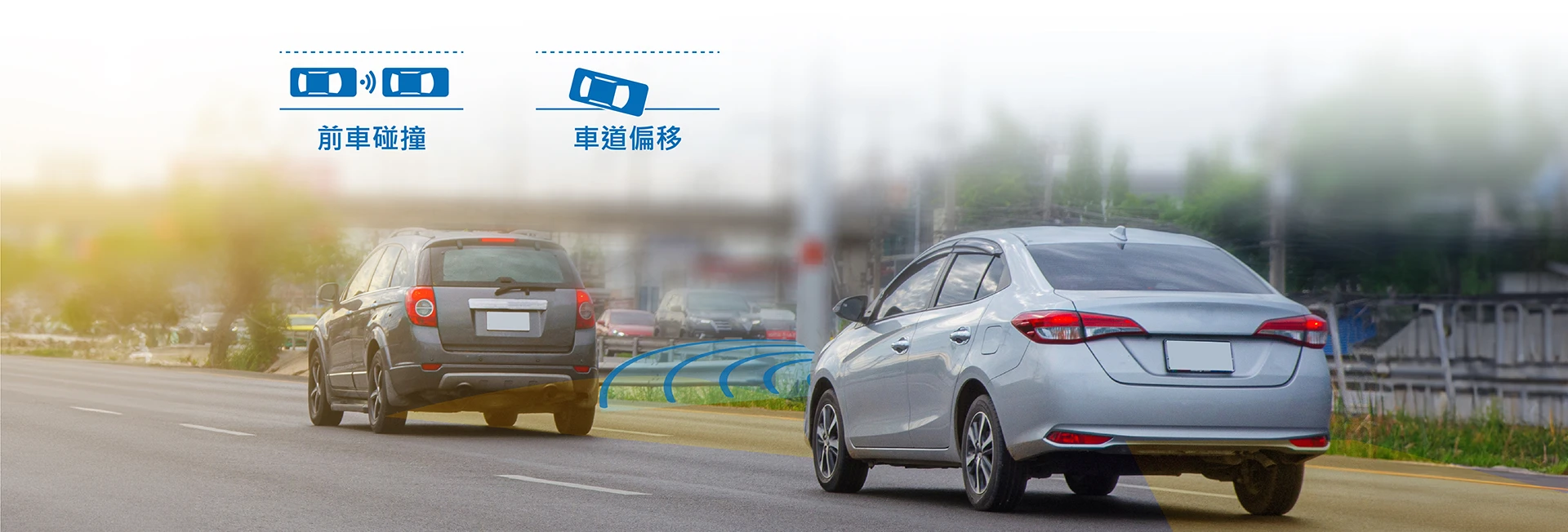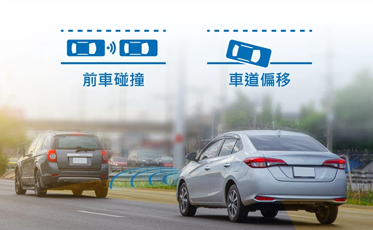 主動偵測「前車碰撞」、「車道偏移」異常,發出警示音提醒司機注意路況。