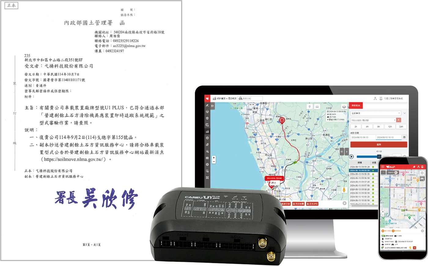我司國土署土石方車機(U1 Plus),已通過國土署「營建剩餘土石方清除機具應裝置即時追蹤系統規範」審驗、核可。不僅能將數據即時、準確地回傳國土署平台達成合規要求,資料可同時回傳至衛星犬車隊管理平台,追蹤車輛歷史軌跡、異常狀態等,提升企業管理效能。